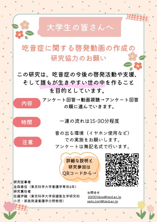 当分野の卒業研究として、吃音症に関する一般向け啓発動画の作成に関する調査を行っています。対象は大学生全般であり、この研究を通して、吃音症に関する今後の啓発活動や、よりよい支援の在り方を考えるきっかけとしたいと考えています。(東京科学大学指針対象外倫理審査委員会 承認番号:E2025-050)